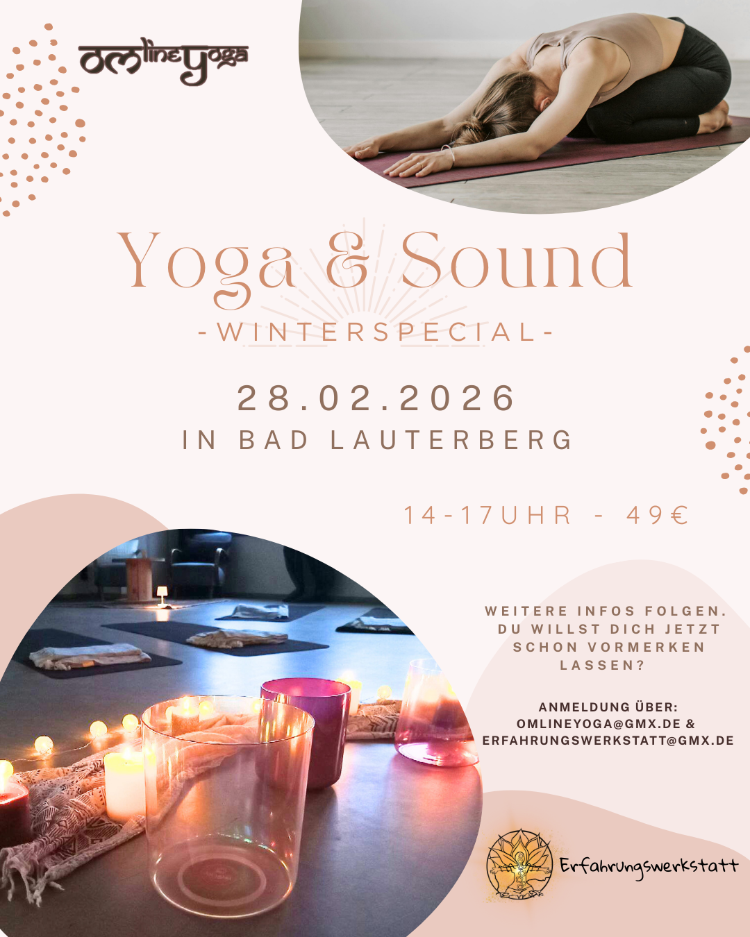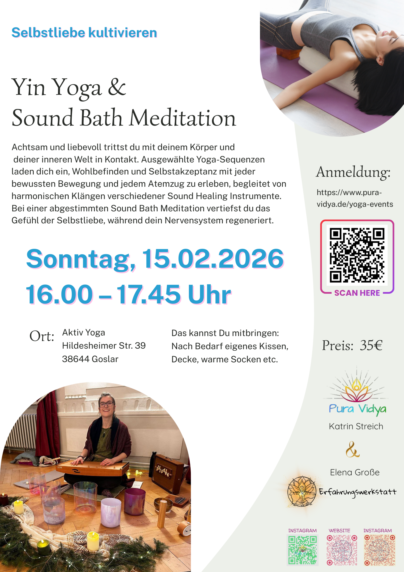 Ein ganz besonderes Erlebnis, mit dem du dich selbst beschenken und verwöhnen kannst: sanftes Yin Yoga, gefolgt von einer wohltuenden Sound Bath Meditation. Mit sanften Haltungen aus dem Yin Yoga öffnest du insbesondere deinen Herzraum, um Liebe für dich selbst und Andere empfangen und vertiefen zu können. Anschließend darfst du dich, eingehüllt in deine kuschelige Decke, in deine Matte sinken und dich von den wohligen Klängen verschiedener Instrumente tragen lassen.